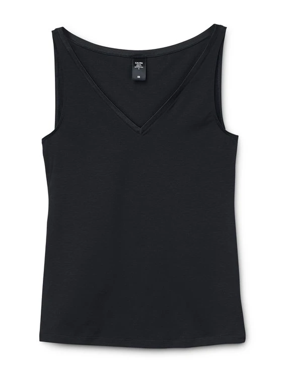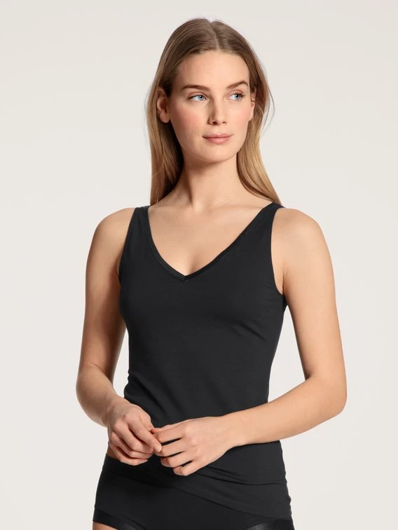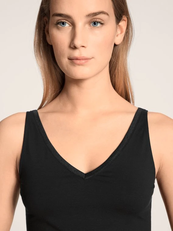 Schlichtes, elegantes Tank-Top aus der Serie CATE von CALIDA. Die Charmeuse-Blende am Dekolleté verleiht dem Shirt ohne Arm einen edlen Look. Besonders praktisch ist, dass die Träger in ihrer Breite so verarbeitet wurden, dass die BH Träger nicht hervorblitzen.