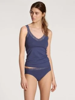 Spaghetti-Top aus der Serie NATURAL COMFORT LACE von CALIDA. Das ärmellose Unterhemd ist ausgezeichnet mit dem swiss+cotton-Gütesiegel. Diese Zertifizierung gilt für Produkte aus allerfeinster, langlebiger und angenehm zu tragender Premium-Baumwolle von höchster Qualität.