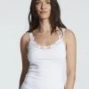 Tank Top mit elegantem V-förmigen Spitzeneinsatz. Durch die Dreifachplattierung ist auf der Haut reine Baumwolle zu spüren, während die Außenseite schimmernde Viskose zeigt. Besonders wertvoll ist die reichhaltige, hochwertig verarbeite Spitze, die das Dekolleté verführerisch einfasst.