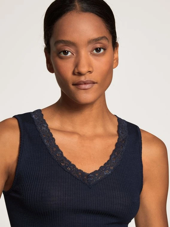 Das ärmellose SILK WOOL JOY Top von CALIDA macht jede Frau zum Fan kalter Temperaturen. Wetten? Hier vereinen wir das Beste aus mehreren Faserwelten: Der edle und weiche Merino-Seiden-Mix spendet angenehme Wärme, bleibt aber federleicht, dünn und anschmiegsam. Die klassisch-elegante Farbe und feminine Spitzendetails verwandeln diese Funktionswäsche in ein echtes Lingerie-Highlight.